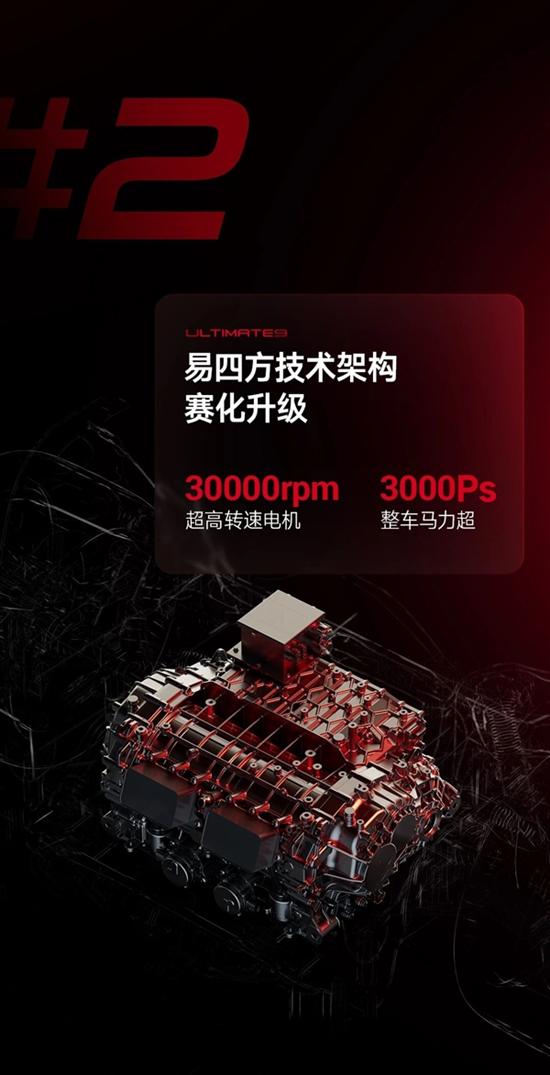 第二,易四方技术平台是仰望U9的动力心脏,它作为全球首个基于30000转高性能电机的四电机平台,单个电机峰值功率高达555kW,系统综合马力超3000Ps。