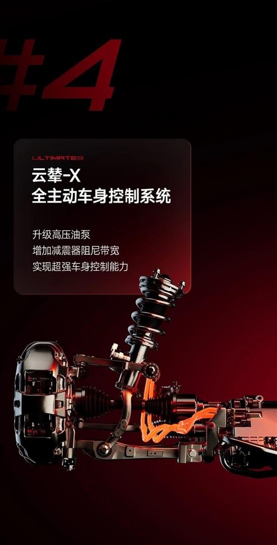 第四,云辇-X智能全主动车身控制系统也功不可没,通过主动调节车身姿态,强化抓地性能,与易四方系统协同作用,为车辆在高速行驶时的稳定与安全提供双重保障。