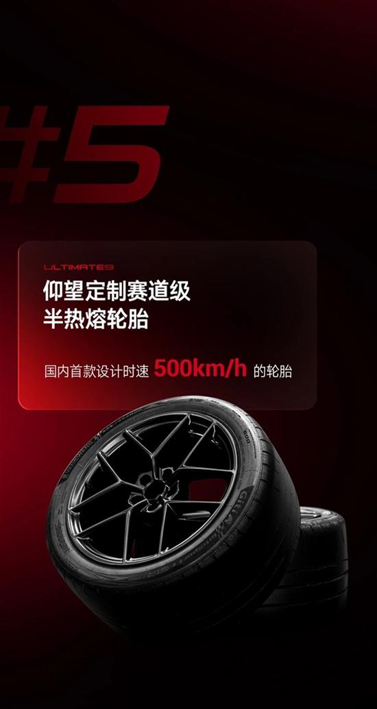 第五,轮胎作为车辆与地面接触的唯一部件,对于高速行驶至关重要。仰望U9搭载国内首款设计时速500km/h的轮胎。宽胎面和半热熔技术增加了与地面的接触面积,大幅提升抓地力。