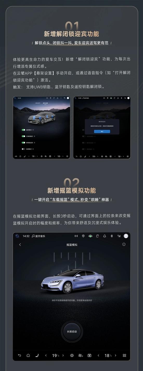 除核心的“摇篮模拟”功能外,交互与娱乐体验也大幅升级。新增“解闭锁迎宾”功能,解锁时车辆点头、闭锁时“抖一抖”,可通过云辇APP手动开启或语音指令激活,支持多种钥匙触发。