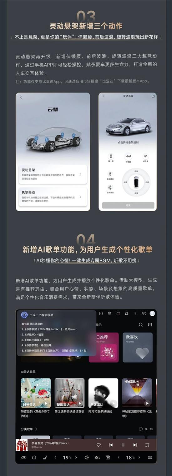 灵动悬架新增伸懒腰、前后波浪、旋转波浪三个动作,需通过最新版比亚迪APP操控。