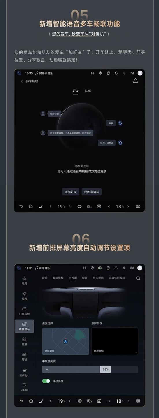 智能交互与实用功能同样有新突破。智能语音多车畅联功能,可实现语音发消息、共享位置等操作;前排屏幕新增亮度自动调节设置;语音识别新增四川话、粤语等10种方言,无需额外设置。