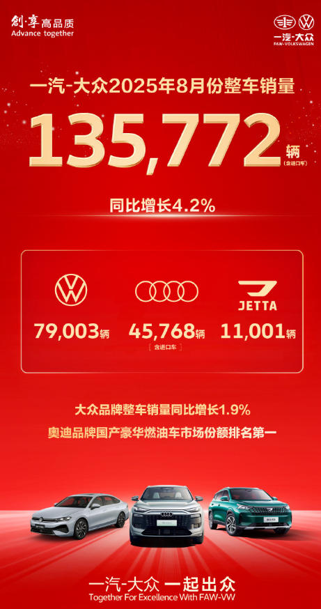 一汽-大众企业官方微博公布一汽大众8月整车销量成绩,共135772辆。大众品牌整车销量同比增长1.9%。其中奥迪(含进口车)销量45768辆,奥迪品牌国产豪华燃油车市场份额排名第一。