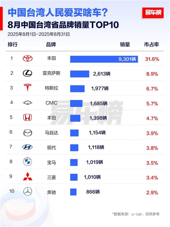 易车榜日前根据u-car数据发布了中国台湾省8月份的汽车品牌和车型销量榜。