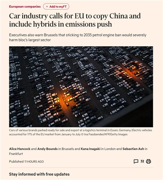 他们警告称,如果布鲁塞尔坚持在2035年全面禁止燃油车,欧盟最大的产业将面临风险。