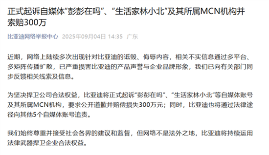 为坚决捍卫公司合法权益,比亚迪将正式起诉“彭彭在吗”、“生活家林小北”等自媒体账号及其所属MCN机构,要求公开道歉并赔偿损失300万元;同时,比亚迪也将通过法律途径向其他5个自媒体账号追责。