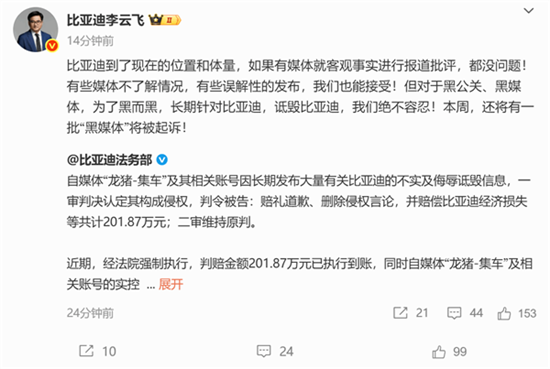 近期,经法院强制执行,判赔金额201.87万元已执行到账,同时自媒体“龙猪-集车”及相关账号的实控人向比亚迪予以书面致歉。