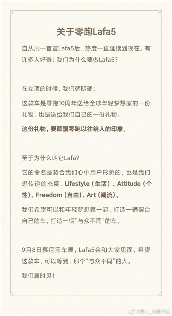 零跑高级副总裁曹力发文表示,自官宣Lafa5以后,热度一直持续到现在,有许多人讨论:零跑为什么要做Lafa5?