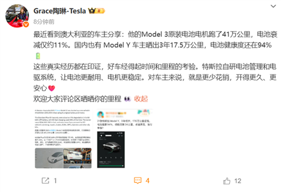她表示,最近看到澳大利亚的车主分享:他的Model 3原装电池电机跑了41万公里,电池衰减仅约11%。国内也有Model Y车主晒出3年17.5万公里,电池健康度还在94%。