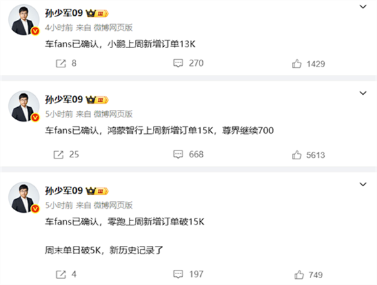 此外,他还公布了零跑和小鹏单周订单,分别为15K和13K,表现也很出色,至于没有公布的,就比较一般的。