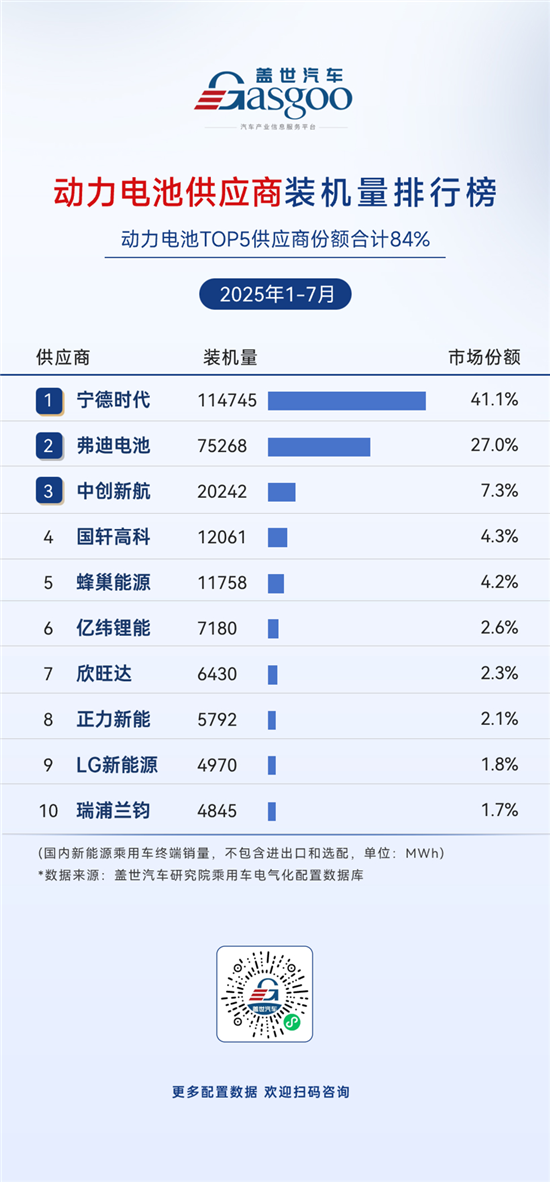 弗迪电池,2025年1-7月装机量75,268 MWh,市场份额27.0%。