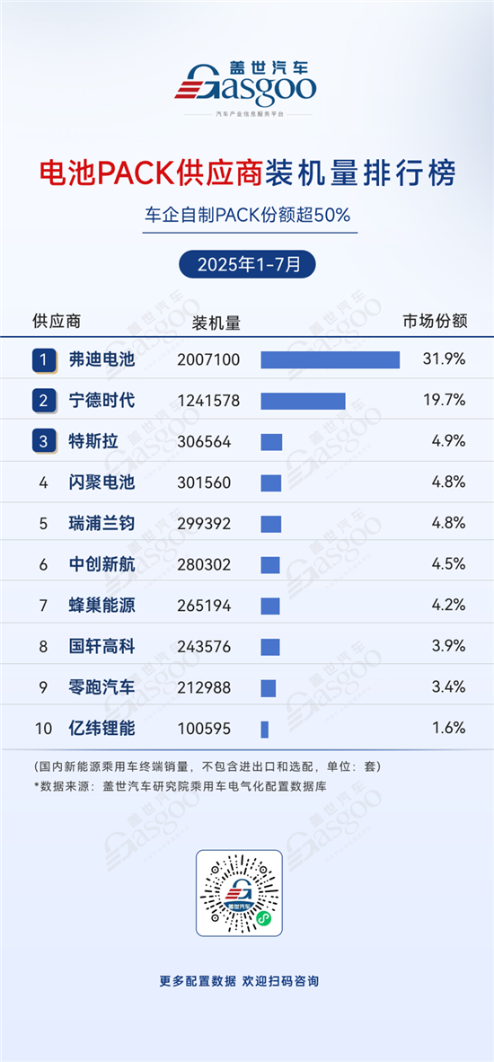 弗迪电池,2025年1-7月装机量2,007,100套,市场份额31.9%。
