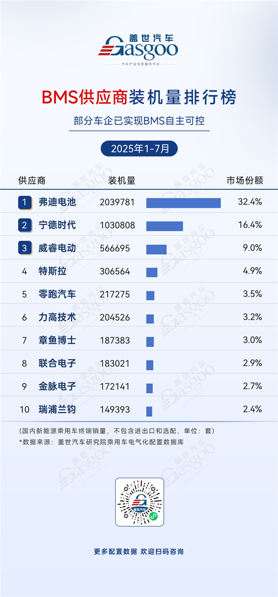 在电池管理系统(BMS)市场中,弗迪电池以32.4%份额、2,039,781套装机量领跑,宁德时代以16.4%份额、1,030,808套位居第二,两者合计接近50%,头部企业在技术与资源上具备一定优势优势,市场集中度较高。威睿电动(9.0%)、特斯拉(4.9%)等也占据一定份额,其余企业市占率均不足5%。同时,特斯拉、零跑等部分车企已实现BMS自主可控,自主化进程持续推进,为未来竞争格局增添更多变量。