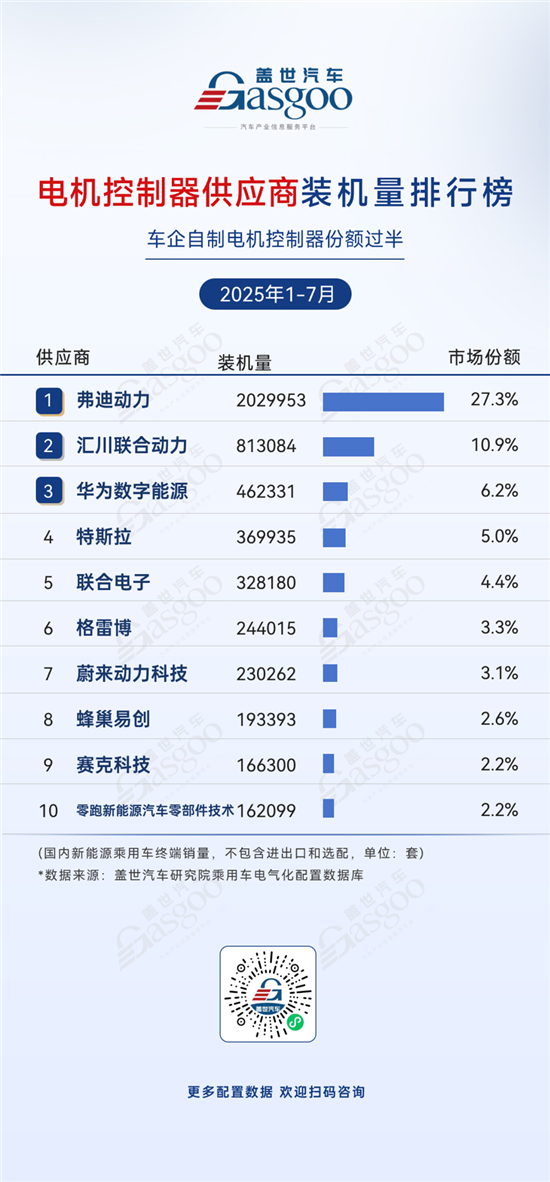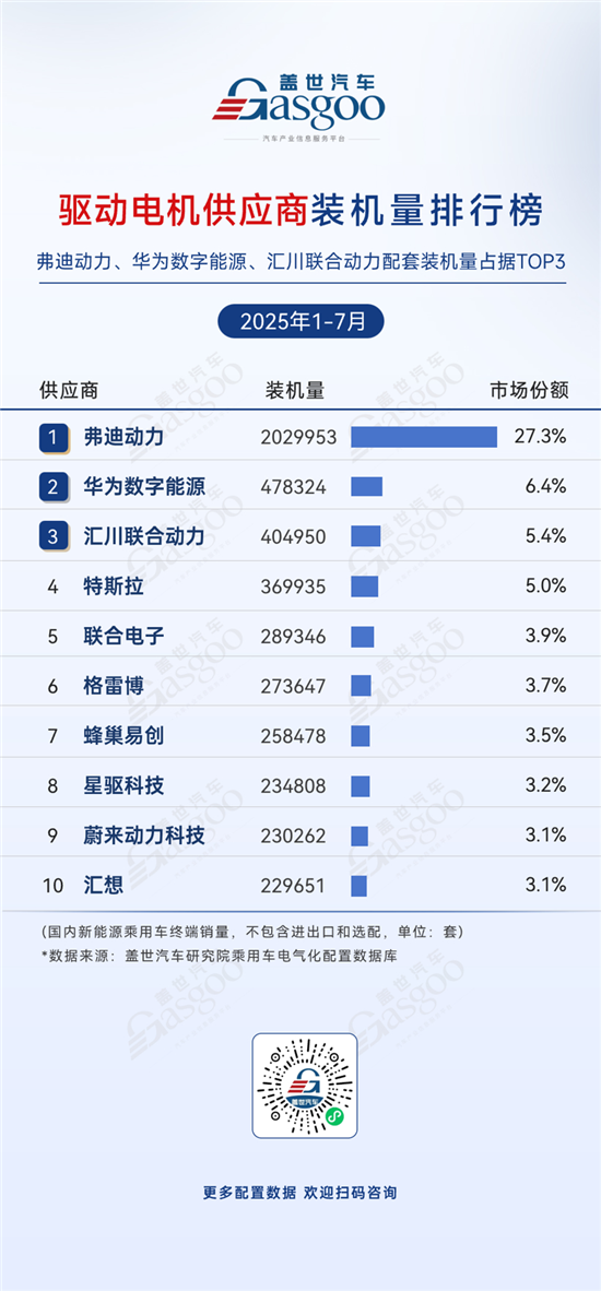 根据盖世汽车研究院数据,2025年1-7月,中国电气化核心零部件市场的竞争格局逐渐明朗。弗迪电池在电池PACK领域以2,007,100套装机量和31.9%的市场份额领跑;动力系统方面,弗迪动力的驱动电机装机量达2,029,953套,市场份额27.3%,此外,弗迪系企业在BMS、电机控制器、OBC等多个核心细分市场均处于领先地位,显示其在新能源汽车核心零部件领域的整体竞争优势。