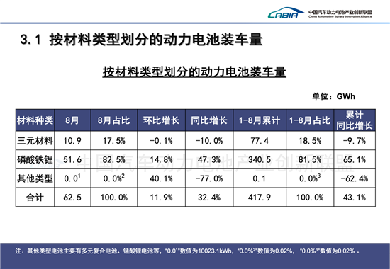 电池联盟数据显示,1-8月,磷酸铁锂电池累计装车量340.5GWh,占总装车量81.5%,累计同比增长65.1%;8月单月装车量51.6GWh,占比82.5%,同比增长47.3%。这一趋势源于磷酸铁锂电池在成本、安全性上的优势,以及车企降本需求的持续释放,尤其在乘用车与商用车领域的应用不断深化。