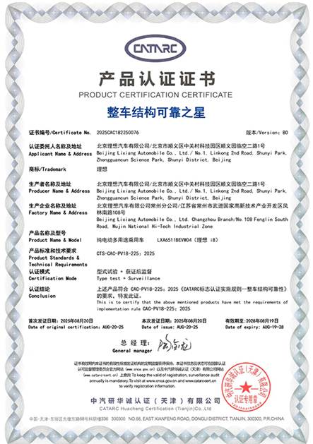 2025年9月5日,理想汽车旗下首款纯电SUV——理想i8荣获中国首个“整车结构可靠之星”001号权威认证。中汽中心华诚认证(天津)有限公司(简称:华诚认证)为其颁发证书,标志着中国汽车工业在可靠性认证体系建设上取得了重大突破。严格来说,这不仅是对理想i8卓越耐久性能的高度认可,更是中国整车可靠性认证体系建设的里程碑。