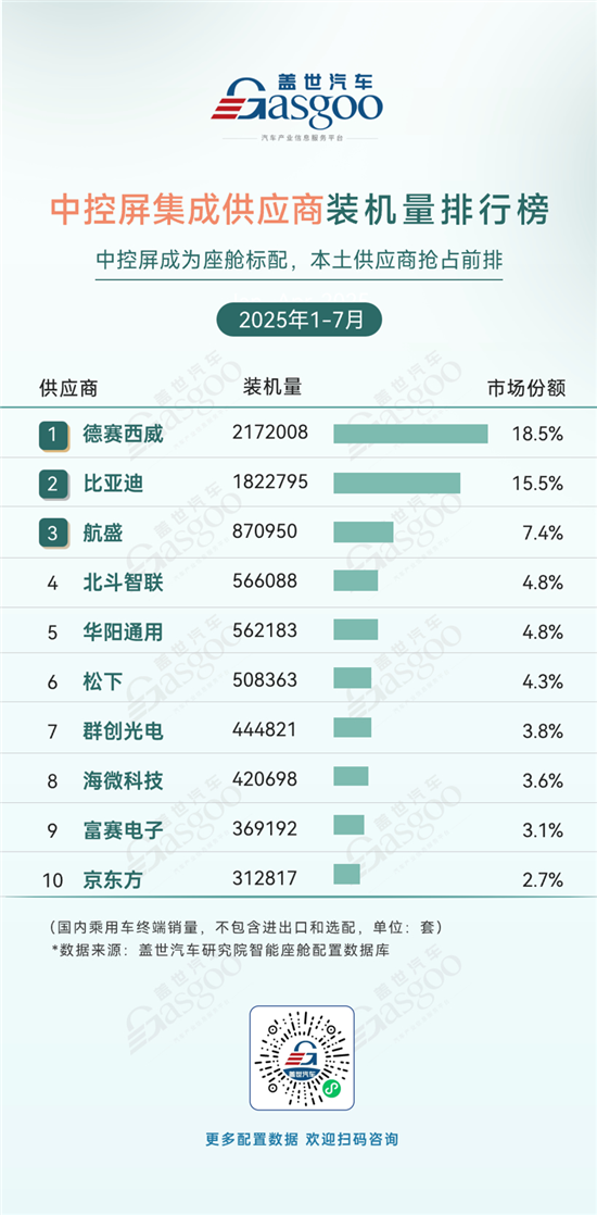 1-7月中控屏集成市场中,本土供应商优势显著。德赛西威、比亚迪稳居前二,合计市场份额超34%,头部本土企业竞争力突出。航盛、北斗智联等本土厂商也凭借技术与产业链协同,在市场中占据重要位置。整体来看,伴随汽车座舱智能化发展,本土供应商在中控屏集成领域加速崛起,凭借对国内市场需求的精准把握和供应链响应优势,持续抢占市场份额,推动行业供给端的国产化进程。