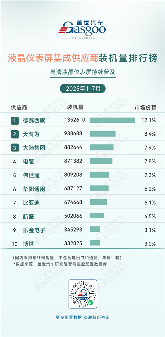 1-7月国内乘用车液晶仪表屏集成供应市场呈多强竞争格局。德赛西威以12.1%的市场份额领跑,装机量超135万套,头部优势显著;天有为、大陆集团、电装、伟世通等中外企业紧随其后,市场份额集中在7.3%-8.4%区间,竞争激烈。整体来看,行业集中度较高但无绝对垄断,本土企业(如德赛西威、比亚迪)与国际Tier1(大陆集团、博世等)共同参与市场竞争,既体现出高清液晶仪表屏普及下供需端对多元供应商的认可,也反映出本土企业在装机量上已具备与国际品牌抗衡的实力,市场竞争呈现全球化与本土化交织的特点。
