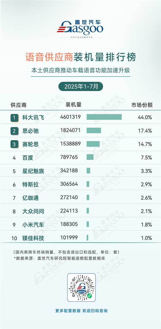 1-7月车载语音市场中,本土供应商占据绝对主导地位。科大讯飞以44.0%的市场份额稳居首位,凭借技术积累与行业深耕形成明显领先优势;思必驰、赛轮思等企业紧随其后,有力推动车载语音功能的迭代升级。百度、星纪魅族等企业依托自身生态资源跨界布局参与竞争,而特斯拉等外资厂商份额则相对有限。整体来看,本土供应商凭借技术适配性与服务响应速度主导市场格局,后续技术迭代能力、生态融合深度将成为竞争核心,外资品牌需进一步强化本土化创新以提升市场影响力。