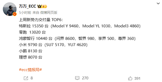 鸿蒙智行为10440辆,组合之后要比小米多,不过单论问界(8600辆),则要少于小米,排在新势力第三名。