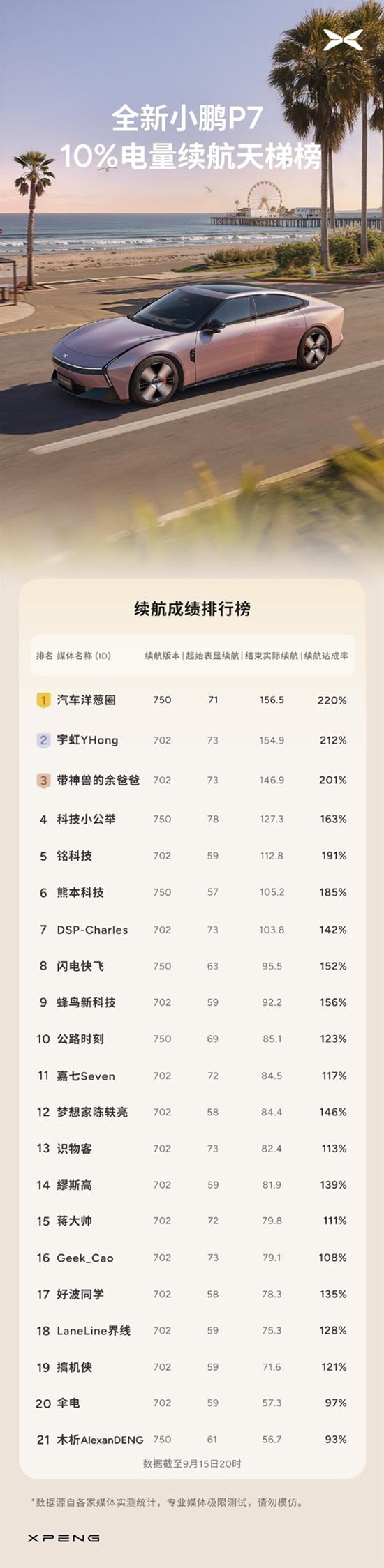 从官方公布的“10%电量续航天梯榜”来看,多家媒体对全新小鹏P7进行了续航实测,前三名续航达成率均超过了200%。