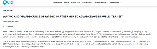 Via联合创始人兼首席执行官Daniel Ramot表示:“我们很高兴,这次与Waymo的合作为自动驾驶汽车(AVs)面向全球数百万公共交通乘客开放铺平了道路,这将提升出行便利性、降低运营成本,并改善安全成效。”
