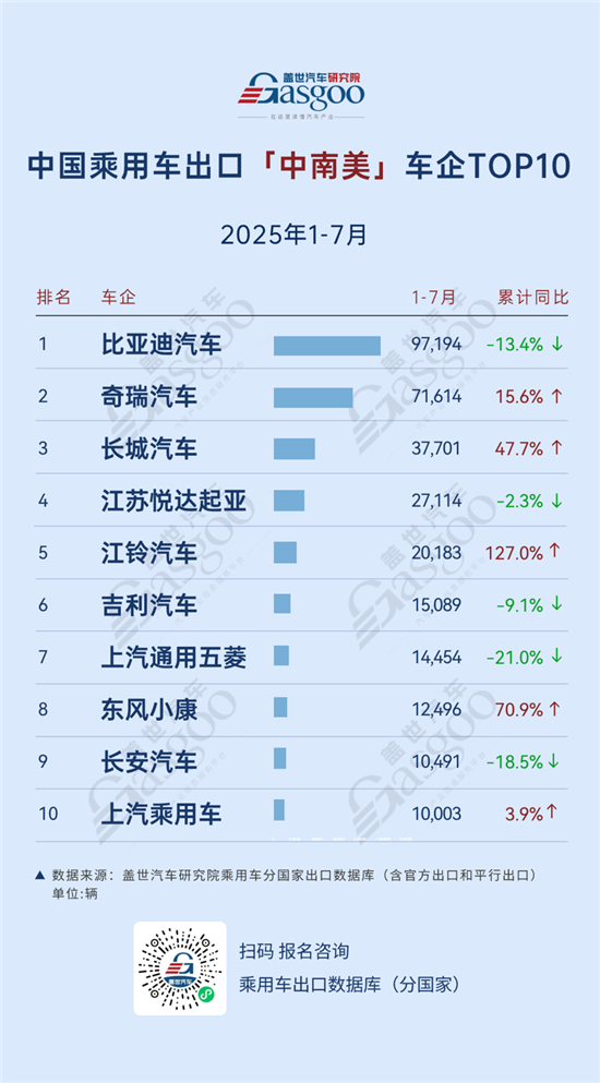 NO.6吉利汽车。2025年1-7月,向中南美出口15,089辆,累计同比减少9.1%。