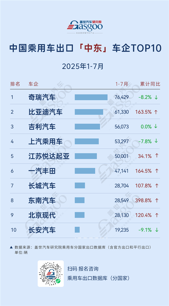 NO.10长安汽车。2025年1-7月,向中东出口19,235辆,累计同比减少9.1%。