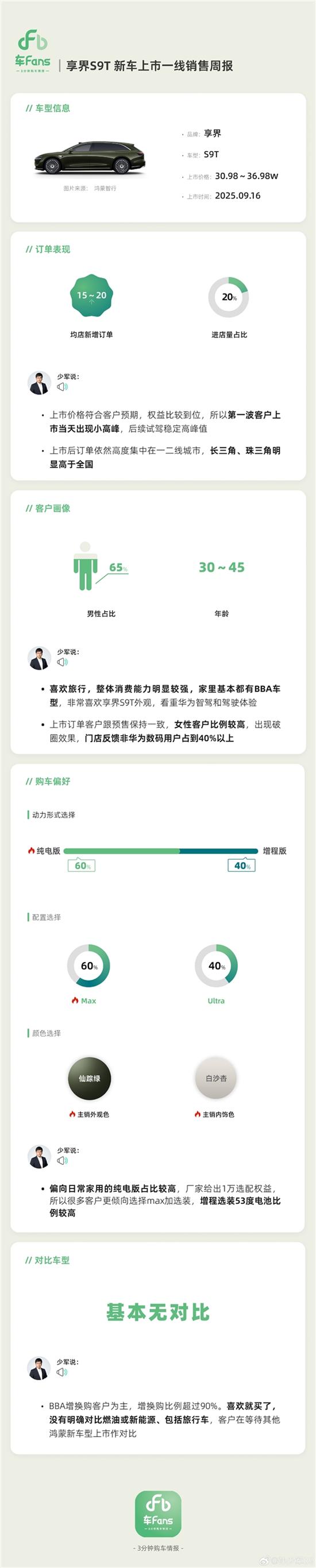 喜欢旅行,整体消费能力明显较强,家里基本都有BBA车型,非常喜欢享界S9T外观,看重华为智驾和驾驶体验。