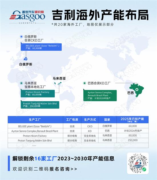 整体来看,吉利根据不同市场特点采取差异化投资策略。在成熟市场通过股权收购快速获取产能(马来西亚宝腾),在新兴市场采用合资方式降低风险(白俄罗斯BELGEE合资工厂),在潜力市场提前布局(入股巴西雷诺工厂)。这种多元模式使吉利能够灵活应对不同国家的政策环境和市场需求,构建起覆盖新兴市场的全球制造网络。下一步需重点推动产能新能源化转型,并通过供应链深度本土化提升抗风险能力,最终实现从“产品出海”到“价值链出海”的升级。