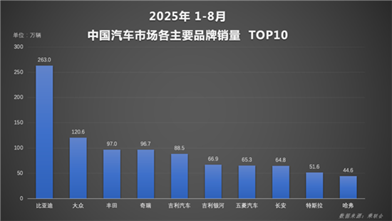 在太平洋汽车发布的8月智能驾驶辅助车型品牌销量榜中,比亚迪以26.37万辆领先,其销量相当于第2至第10名品牌之和。