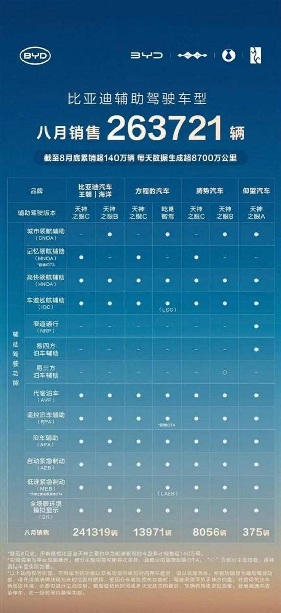 值得一提的是,比亚迪年初发布的“天神之眼”辅助驾驶系统,搭载车型累计销量已超140万辆,8月辅助驾驶车型国内销量占比达90%,每天生成的辅助驾驶数据里程超8700万公里。