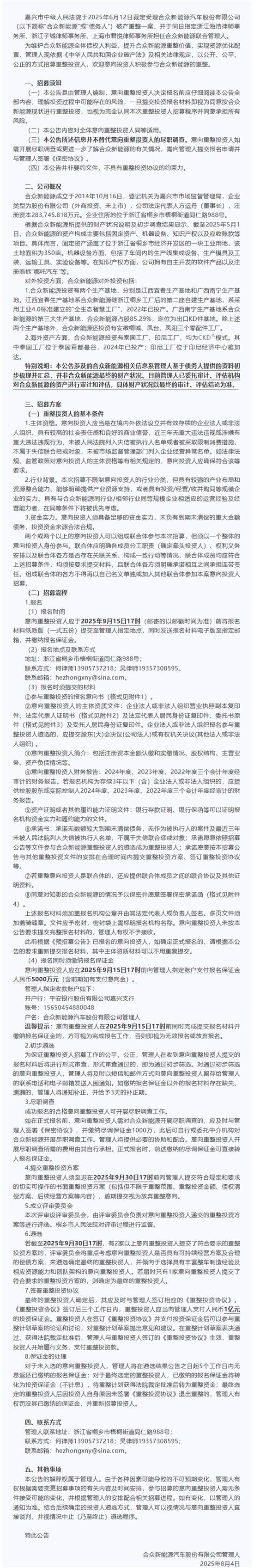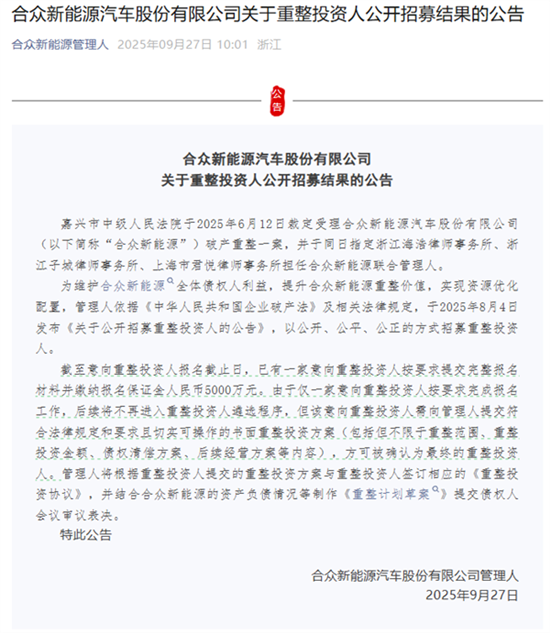 合众新能源汽车管理人发布《合众新能源汽车股份有限公司关于重整投资人公开招募结果的公告》。