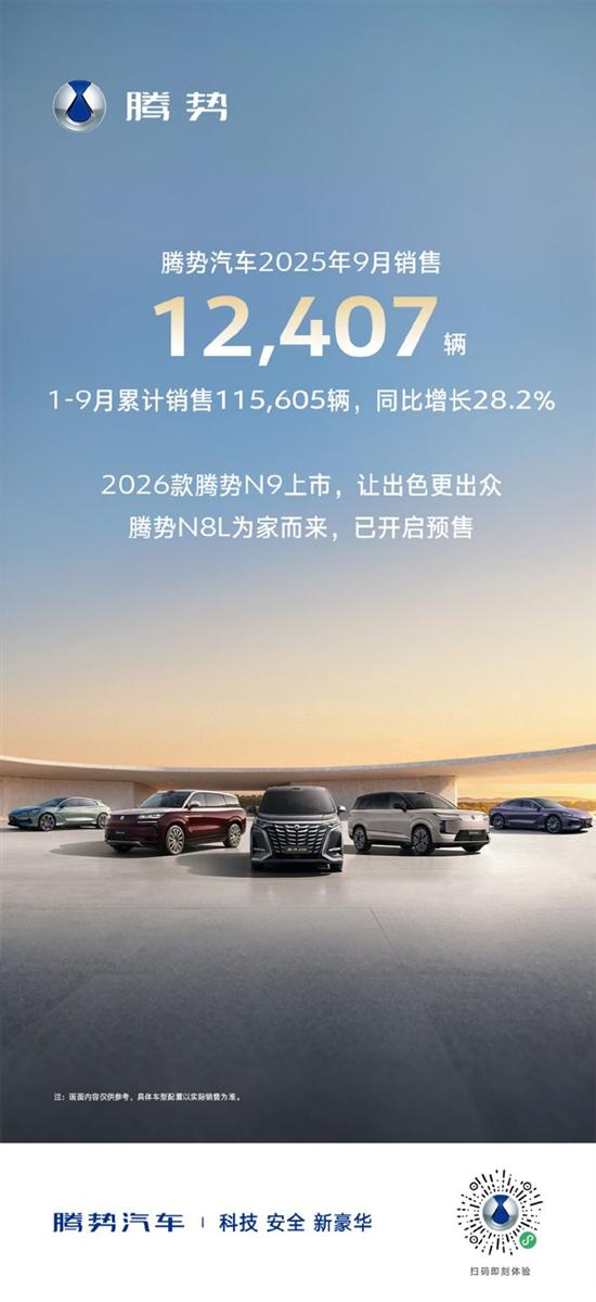 近日,腾势汽车公布了9月销量成绩,腾势汽车9月销售12407辆,1-9月累计销售115605辆,同比增长28.2%。