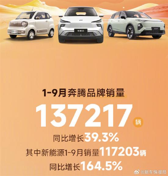 一汽奔腾公布9月最新销量。9月整车销量18880辆,创10年内历史新高。其中新能源车销量16214辆;1-9月奔腾品牌销量137217辆,同比增长39.3%,其中新能源销量117203辆,同比增长164.5%。