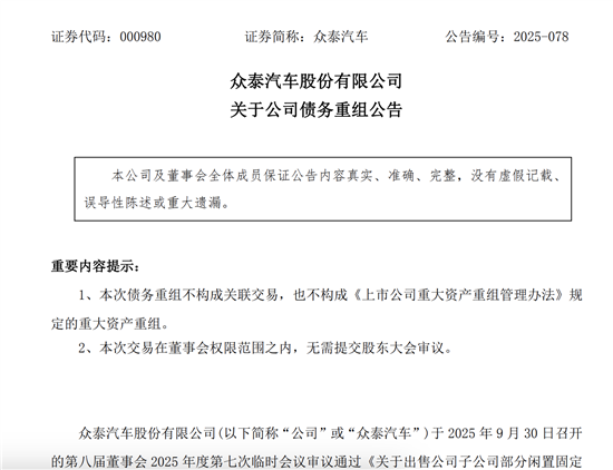 众泰汽车强调,本次债务重组不构成关联交易,也不构成《上市公司重大资产重组管理办法》规定的重大资产重组。