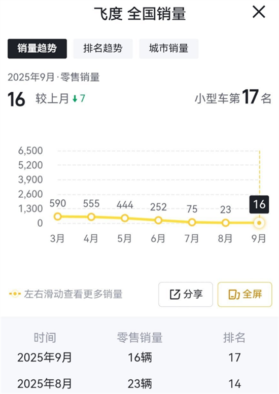 数据显示,在9月份,该车销量仅为16辆,相比于8月份的23辆环比爆降30%,同比去年9月份(815辆)更是暴跌98%。
