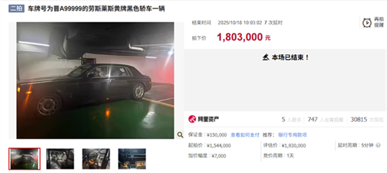 一辆车牌号为晋A99999劳斯莱斯黄牌黑色轿车,经过激烈的拍卖,最终以180.3万元的价格成功易主。