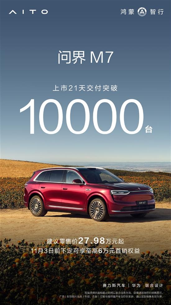 全新一代问界M7于9月23日上市,起售价27.98万,顶配更是高达37.98万,虽然价格不算低,但还是吸引了非常多的下定,24小时就突破了4万台,在国庆8天假期里更是揽获了1.5万的大定。