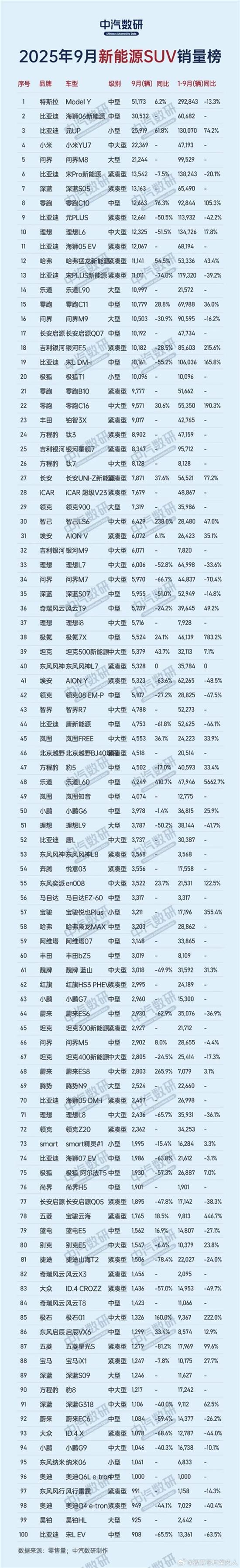 近日,中汽数研发布9月新能源SUV销量Top100数据。