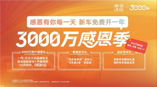 3000万辆是一座里程碑,也是一个新起点。在追求品质的永恒道路上,一汽-大众以匠心铸就经典,用创新引领未来,持续为中国家庭提供可靠、安全的出行体验,不负用户对“国民神车”的信赖。值得一提的是,目前“3000万用户感恩礼”活动仍在进行中,一汽-大众大众品牌车主于10月27日前报名参与,即有机会赢取新车一年免费使用权,千万别错过!