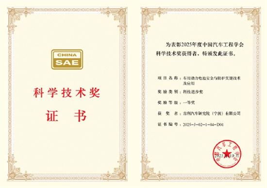 据媒体报道,近日,吉利汽车“车用动力电池安全与防护关键技术及应用”项目,荣获2025年度“中国汽车工程学会科学技术奖”科技进步奖一等奖。