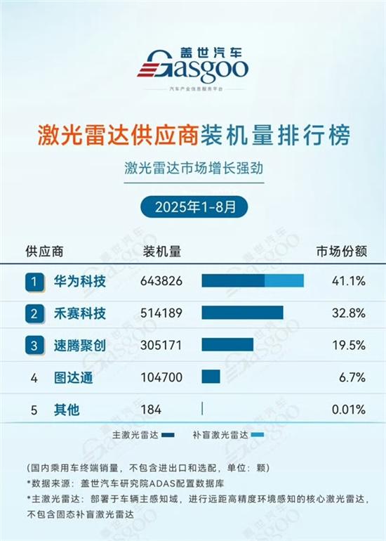 近日,盖世汽车发布了2025年1-8月激光雷达供应商装机量排行榜,华为科技以643826的装机量位列第一,市场份额来到了41.1%。