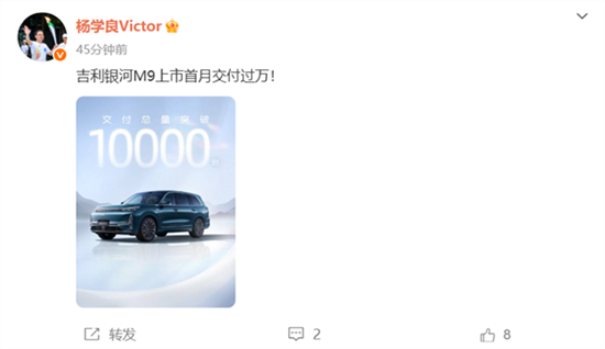 吉利银河官方宣布,吉利银河M9上市1个月,交付总量突破万台。