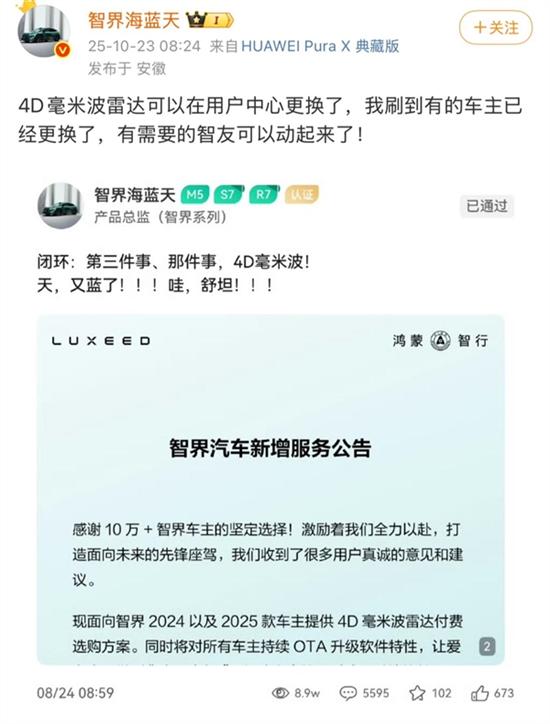 鸿蒙智行智界品牌宣布,针对2024及2025款车型推出的4D毫米波雷达付费选购方案已启动用户中心更换服务。