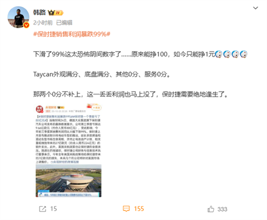 汽车大V韩路发文锐评“保时捷销售利润暴跌99%”。