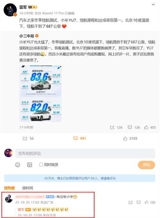 博主还表示,“我看直播,跑YU7的媒体都要跑崩溃了,其它车早跑完了,YU7还有很多续航。而且小米最近宣布给用户兜底购置税,网上好评一片,黑子还尬黑就真没意思了。”
