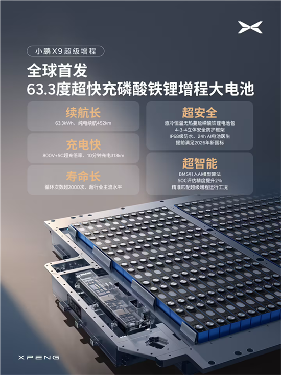 日前,小鹏汽车正式公布小鹏 X9“超级增程”车型的电池核心信息,新车将搭载全球首发的63.3度超快充磷酸铁锂增程大电池,CLTC工况下纯电续航达到了452km,并且支持800V+5C超充倍率,10分钟即可充电313km,电池循环次数更超2000 次。
