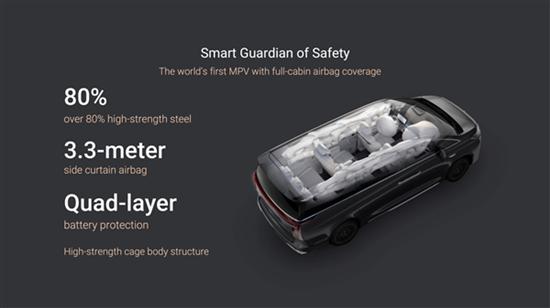 采用三重高强度笼式车身结构,高强度钢占比高达 81.96%,是全球首款配备全舱侧帘气囊的MPV,。