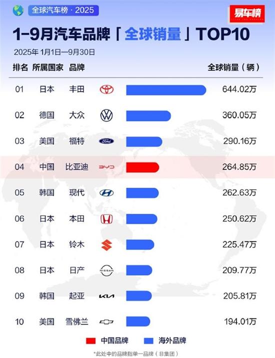 中国品牌中仅有比亚迪跻身前十,以264.85万辆位列第四,成为榜单中唯一的“中国面孔”。